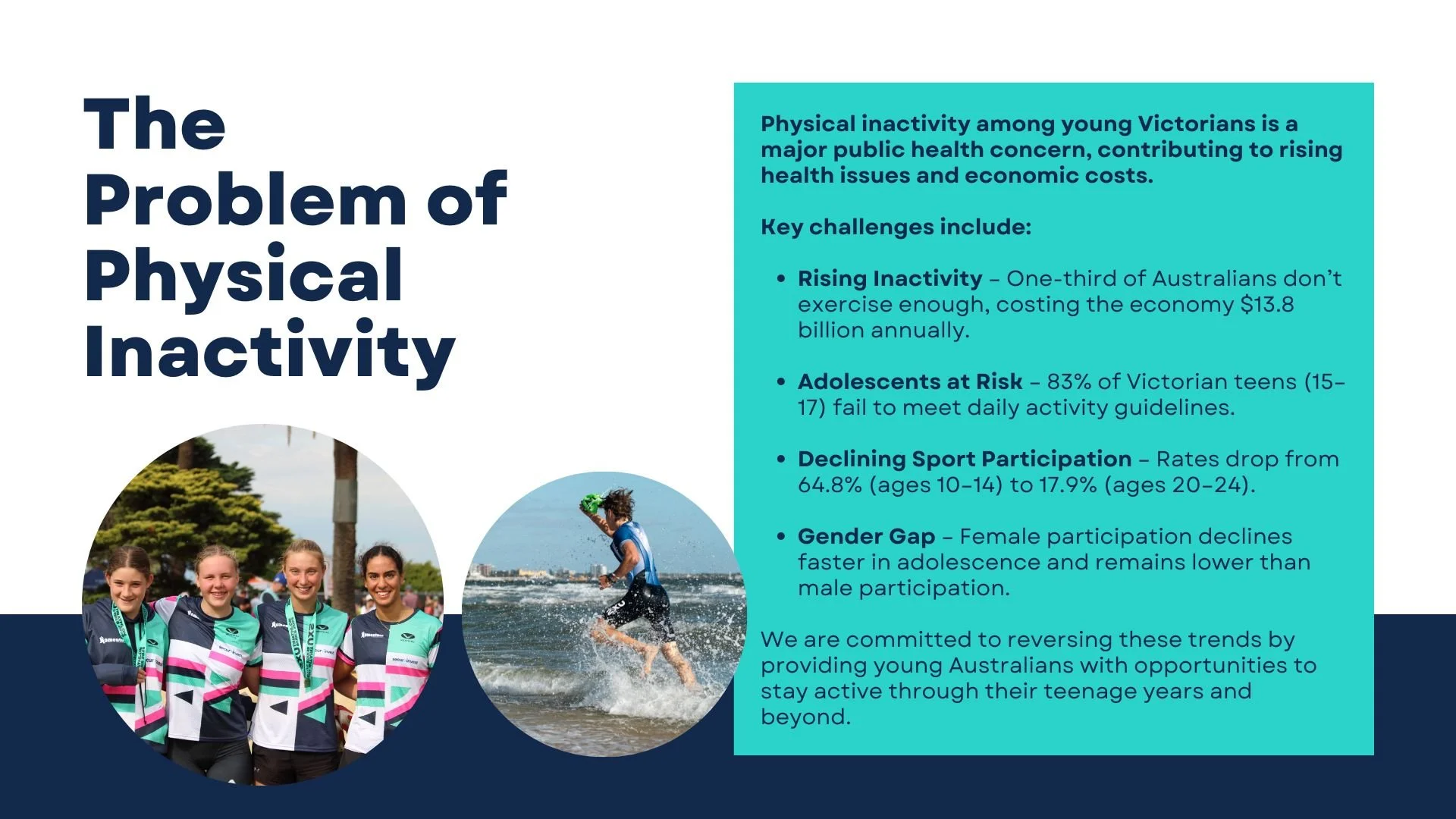 Right now, physical inactivity is one of the biggest health challenges facing young Victorians. Sport participation in Victoria drops steeply after the age of 14, with just 17.9% of 20–24-year-olds still involved in organised sport. For young women, the decline is even sharper.