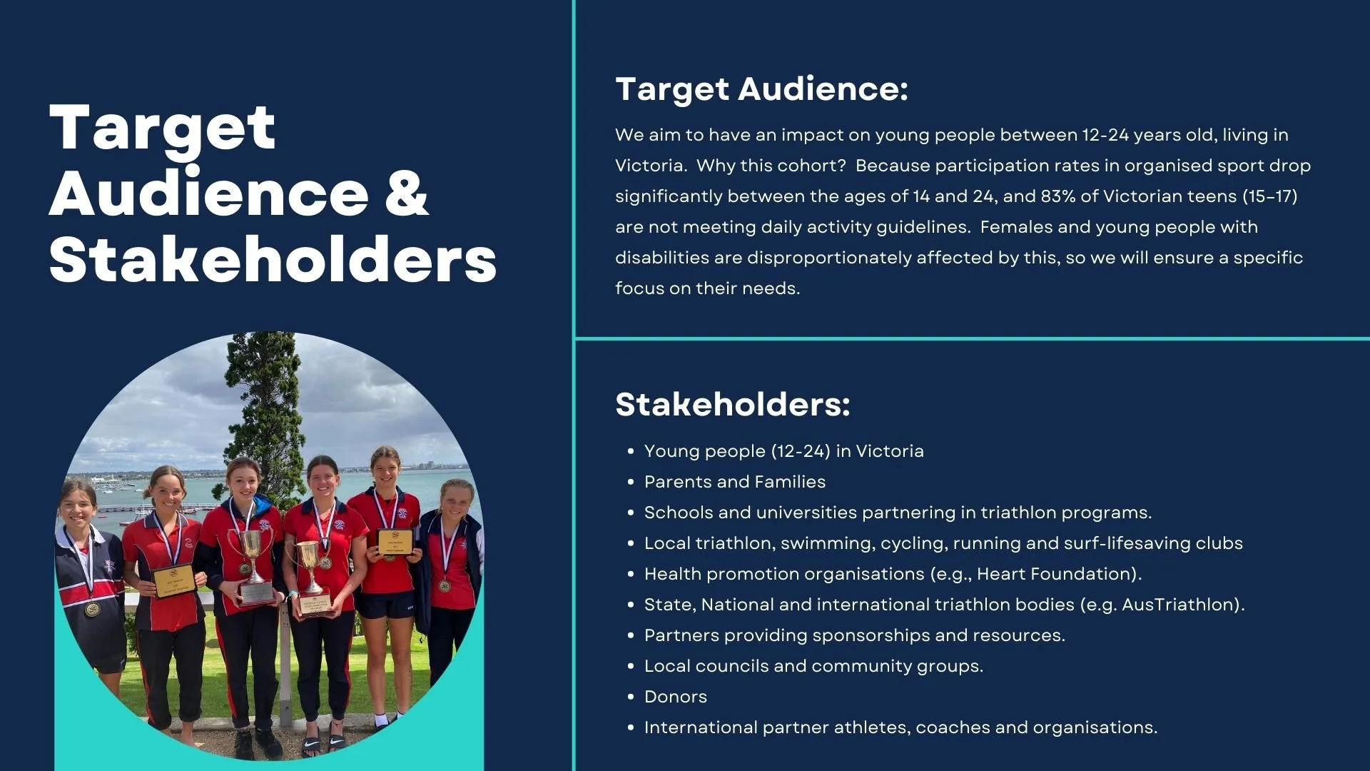 The strategy is built on five key goals: promoting lifelong health and wellbeing through initiatives like Get Active, Stay Active; co-creating inspiring, accessible experiences such as our Active in Nature Series; increasing participation by breaking down barriers for young women and para-athletes through programs like Tri-Cycle and our Junior Race Series; developing a performance pathway that supports aspiring elite athletes with coaching, scholarships, and international exposure; and ensuring long-term sustainability by building strong partnerships, funding streams, and leadership opportunities for young people.